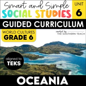 Are you a 6th grade middle school social studies teacher looking to find quality TEKS-aligned resources that cover Oceania? Looking for minimal-prep and engaging lessons and activities to teach social studies concepts to your 6th grade students? Look no further! This Unit 6 BUNDLE of the Smart and Simple Social Studies Guided World Cultures Curriculum…