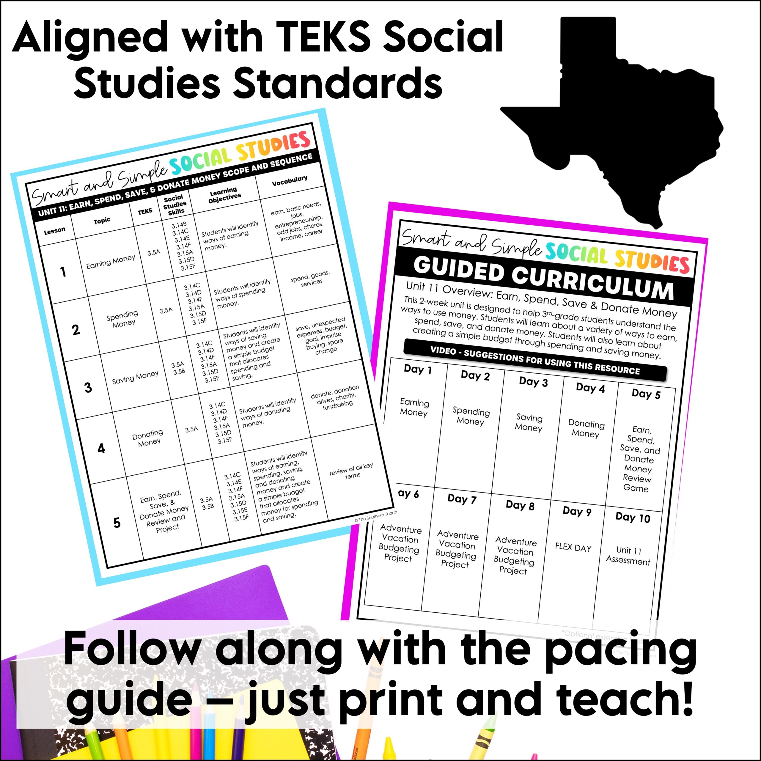 Are you an upper elementary teacher looking to find a quality TEKS-aligned resource that targets earning, spending, saving, and donating money? Looking for minimal-prep and engaging lessons and activities to teach social studies concepts to your 3rd grade students? Look no further!