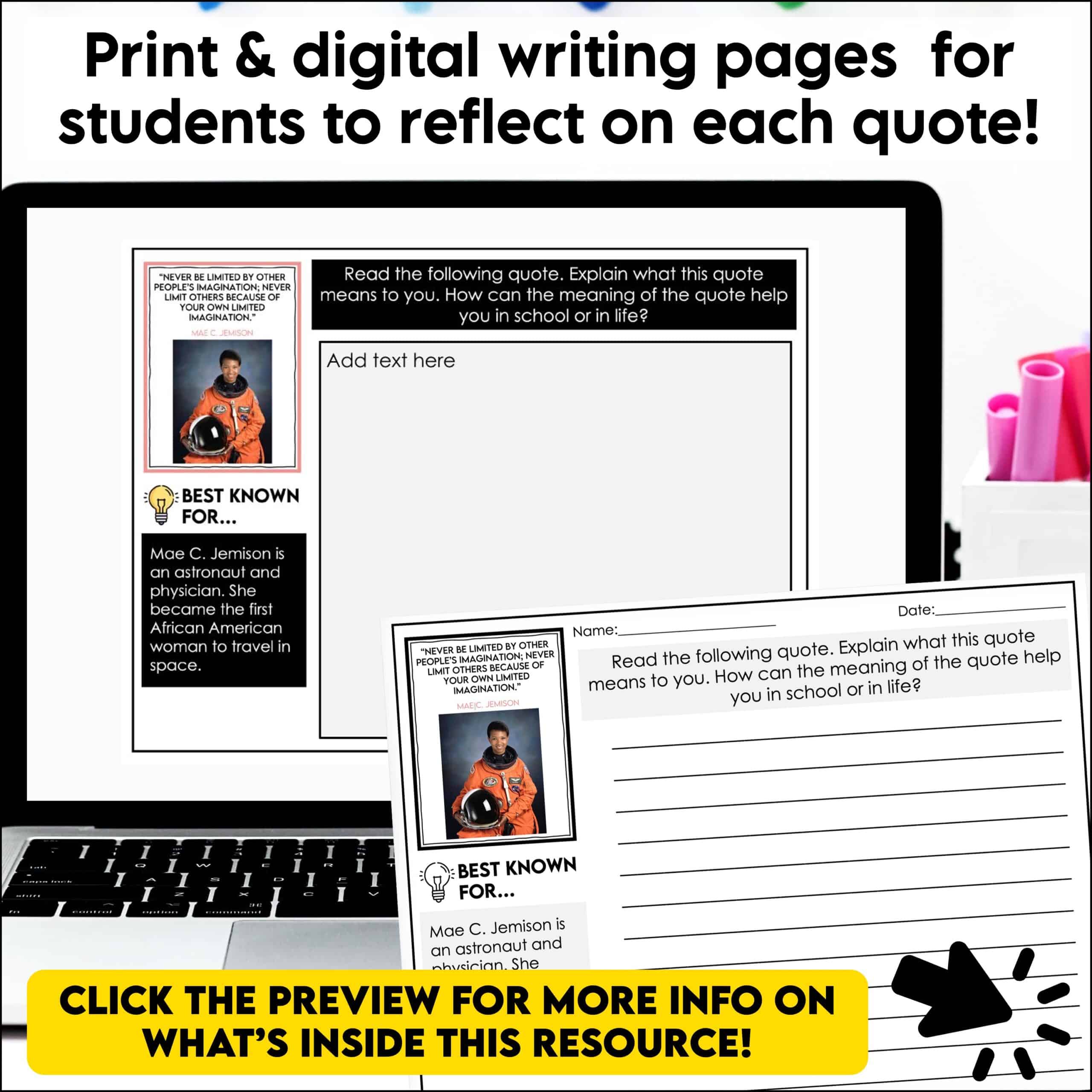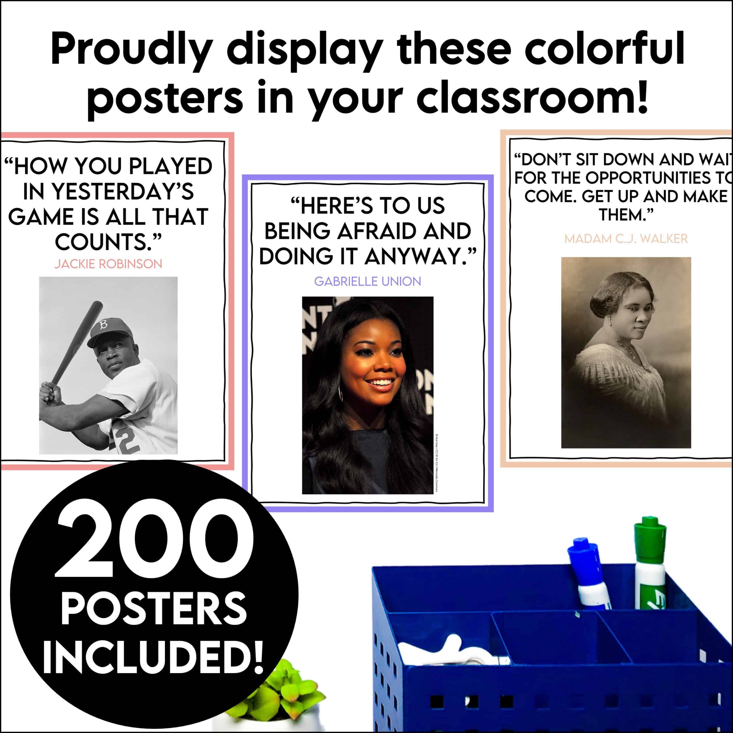 There are so many different ways you can use this amazing bundle of posters! Highlight a famous person in February during black history month, have students research more information about each person for a research inquiry project, use as a writing reflection or warmup activity, and so much more!