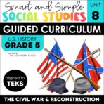 Unit 8 of the Smart and Simple Social Studies Guided U.S. History Curriculum is about The American Civil War and Reconstruction. The main topic of this unit is designed to help upper elementary students understand the causes and effects of the Civil War, major events and battles during the war, important figures of the Civil War, and the goals during the Reconstruction period.