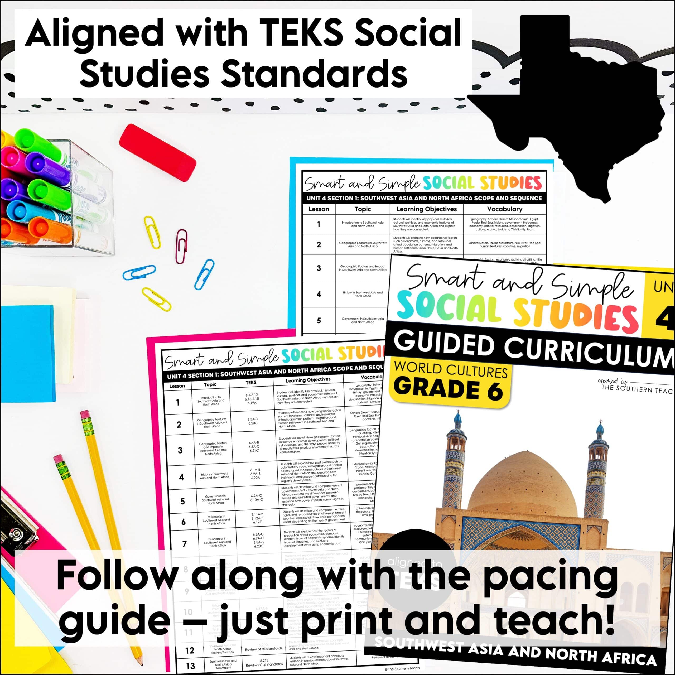 This unit primarily correlates to the current TEKS 6th grade Social Studies standards (adopted 2024). It includes EVERYTHING you need to teach about the region of Southwest Asia and North Africa – just print & go!