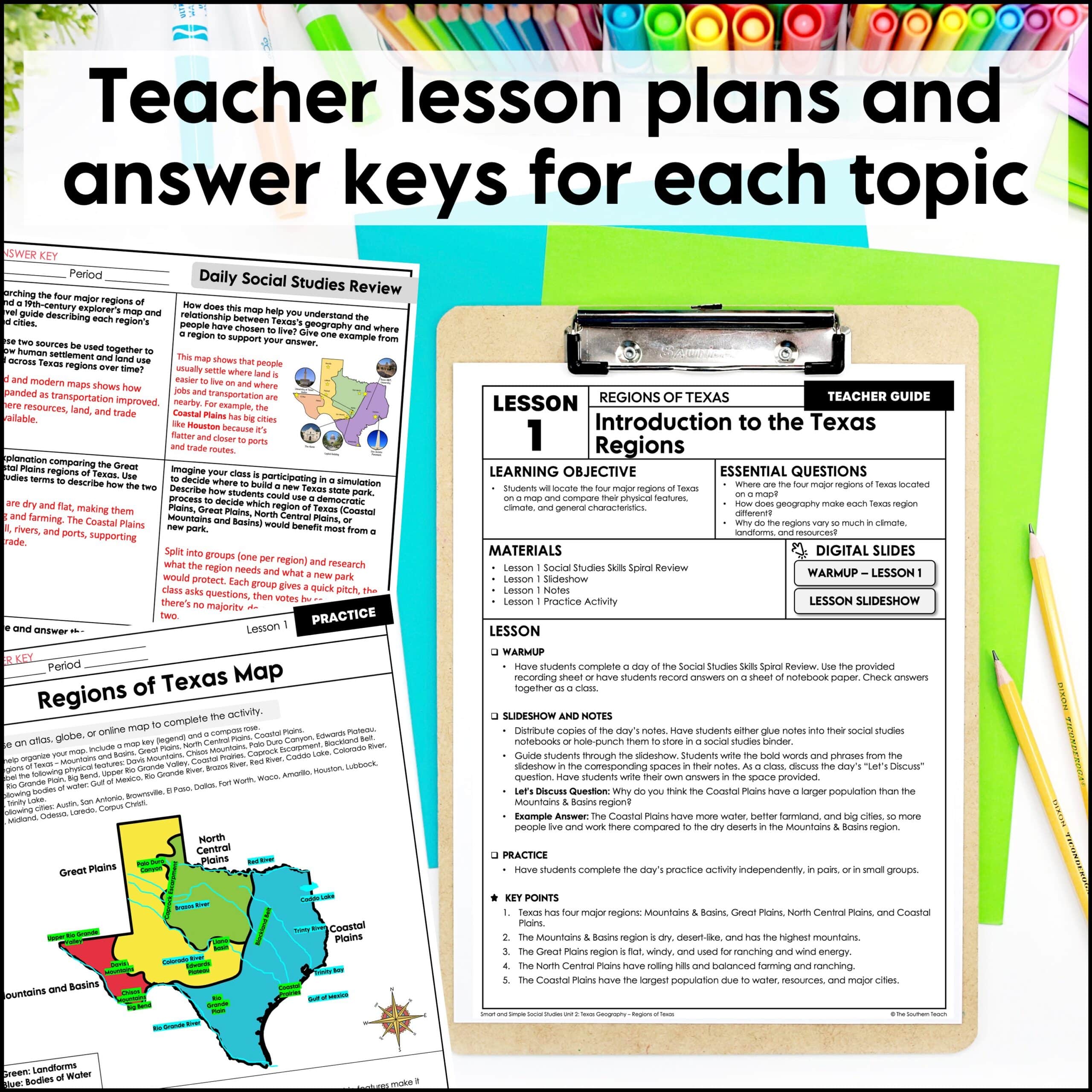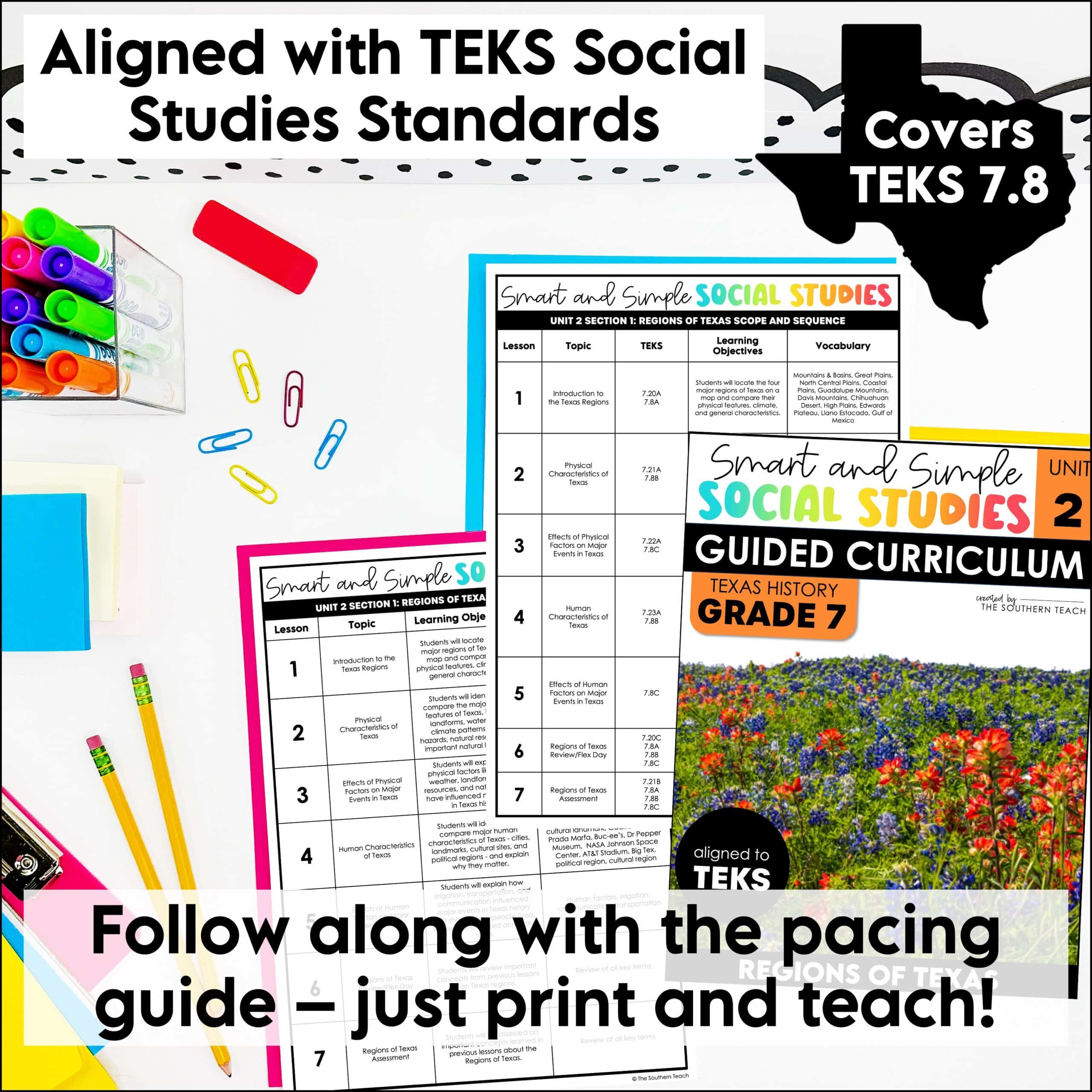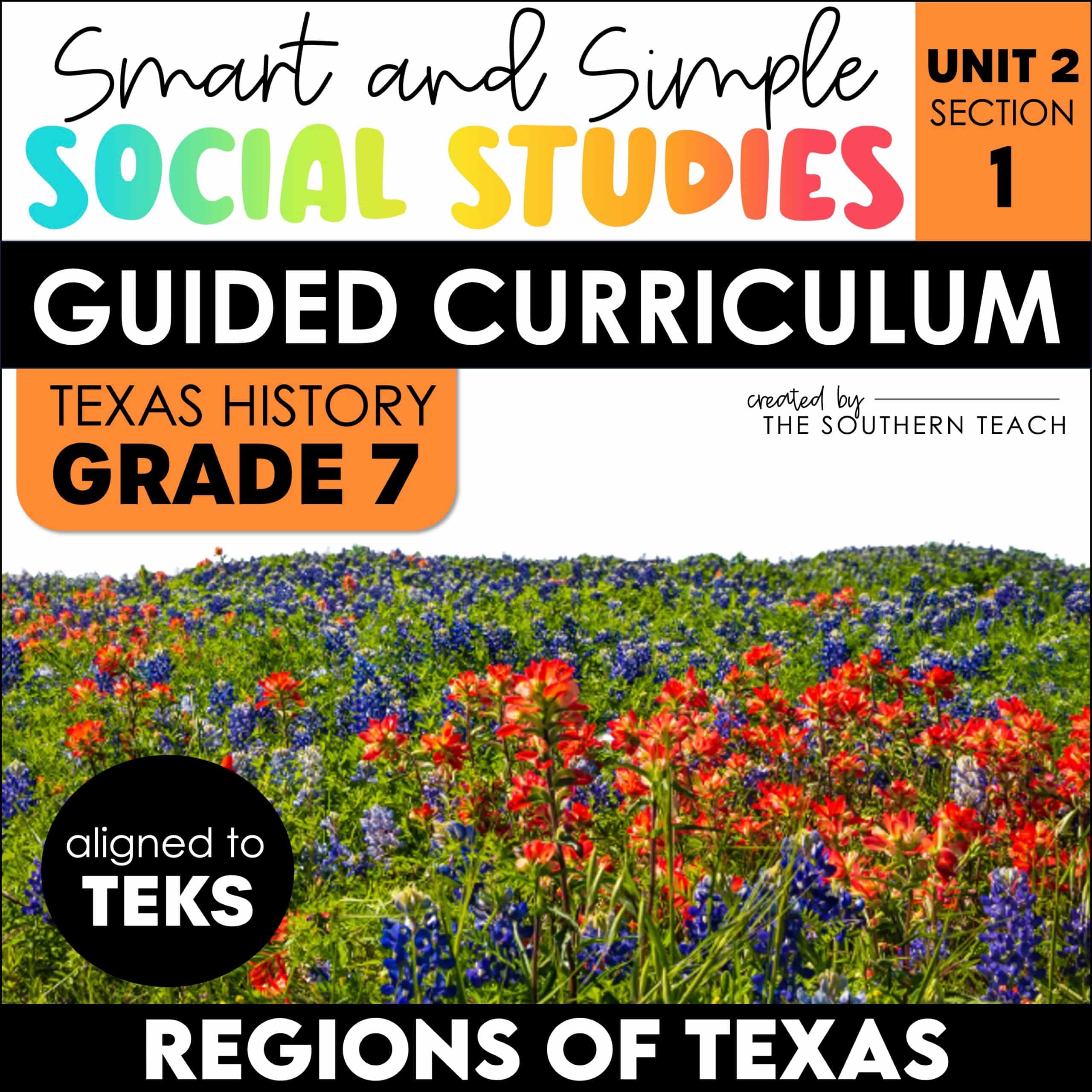 Unit 2 Section 1 of the Smart and Simple Social Studies 7th Grade Texas History Guided Curriculum is about Regions of Texas. The Regions of Texas section teaches students about the state’s major physical regions and their defining landforms and climates. Students learn how each region’s geography influences settlement, culture, and economic activities.