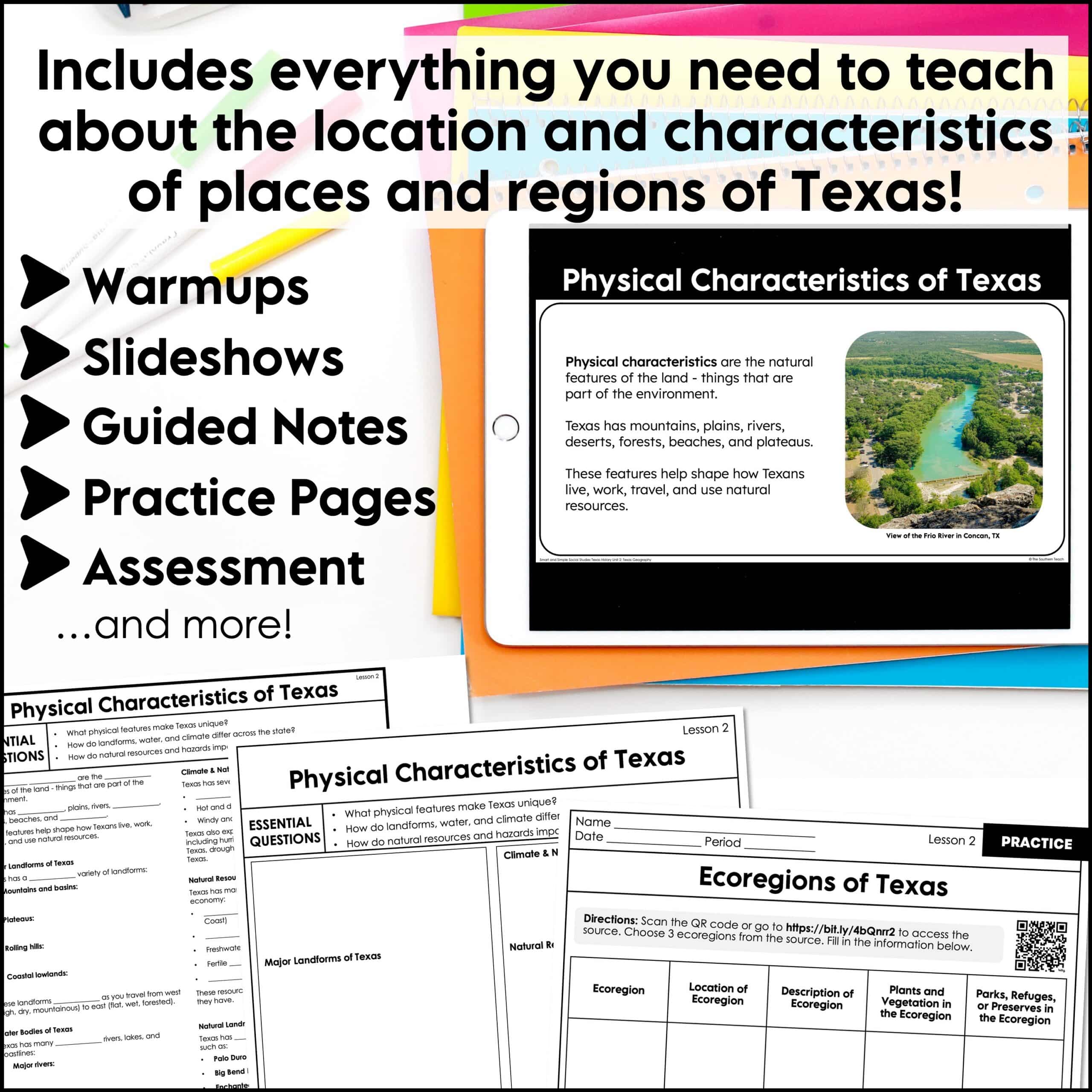 This unit primarily correlates to the current TEKS 7th grade Social Studies standards (adopted 2024). It includes EVERYTHING you need to teach about the Regions of Texas – just print & go!